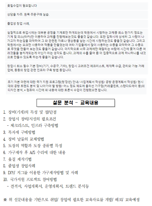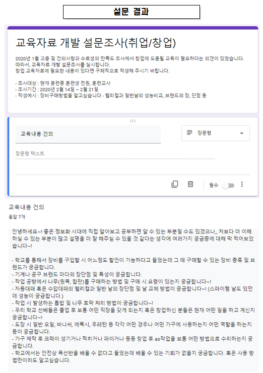- 고충 및 건의사항의 의견 중 취업 및 창업에 대한 교육이 필요하다는 요구에 따라 설문조사 실시