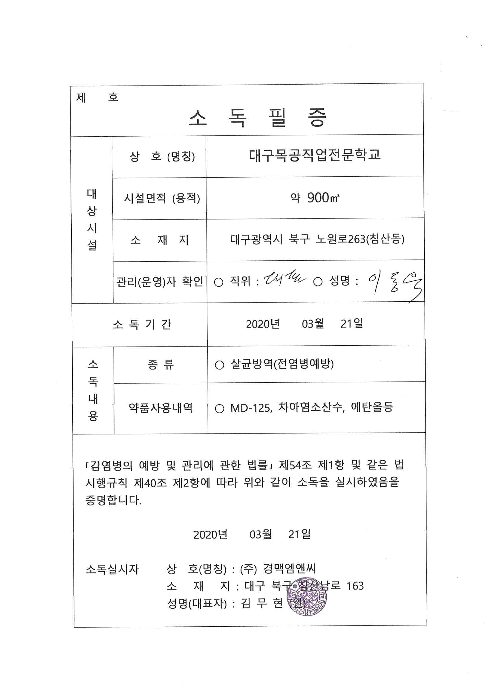 전문업체를 통한 방역실시.